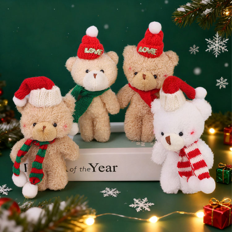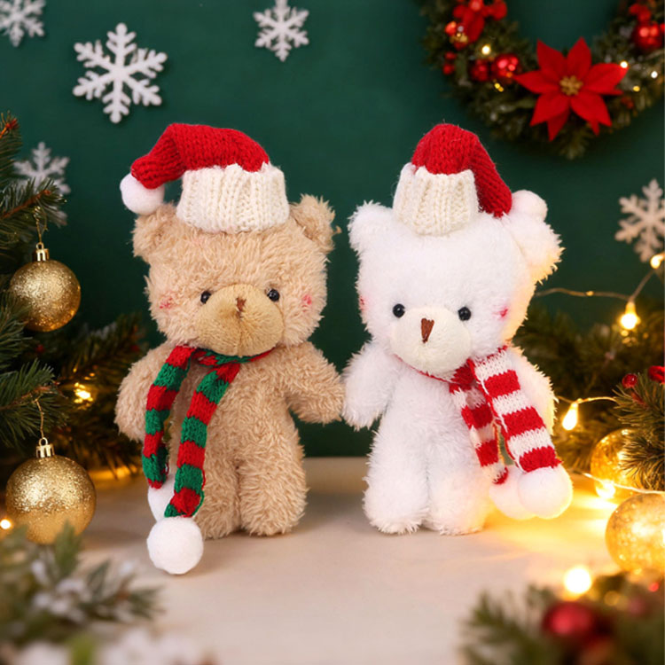 Este brinquedo de pelúcia de Natal está na forma de um ursinho de pelúcia, possui dois materiais diferentes, ou seja, luxuosos e lã de pelúcia. O pêlo do velo de pelúcia é levemente encaracolado. Ambos os materiais têm uma textura suave e macia e são muito leves. O urso de lã de pelúcia vem em duas cores: marrom claro e marrom escuro. O urso de pelúcia também tem duas cores: marrom e branco. Cada urso é emparelhado com um lenço diferente, e cada urso está usando um chapéu de Natal vermelho, adicionando um toque festivo. Os lenços e chapéus dos ursos são tricotados e são decorados com pompoms brancos, parecendo muito delicados. Os olhos do urso são pretos e suas bochechas são pontilhadas de blush, tornando -o muito fofo. Sua aparência ganhou o amor de muitos clientes.