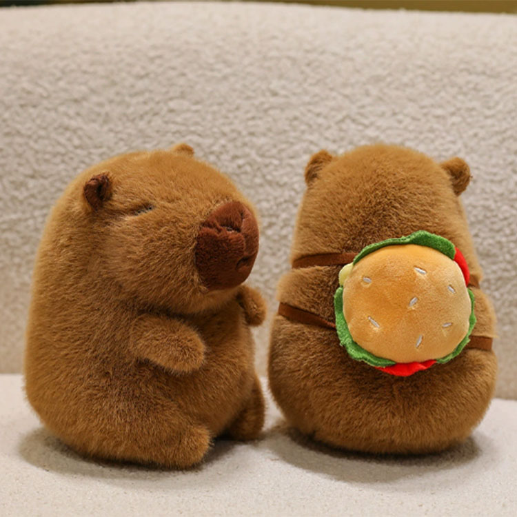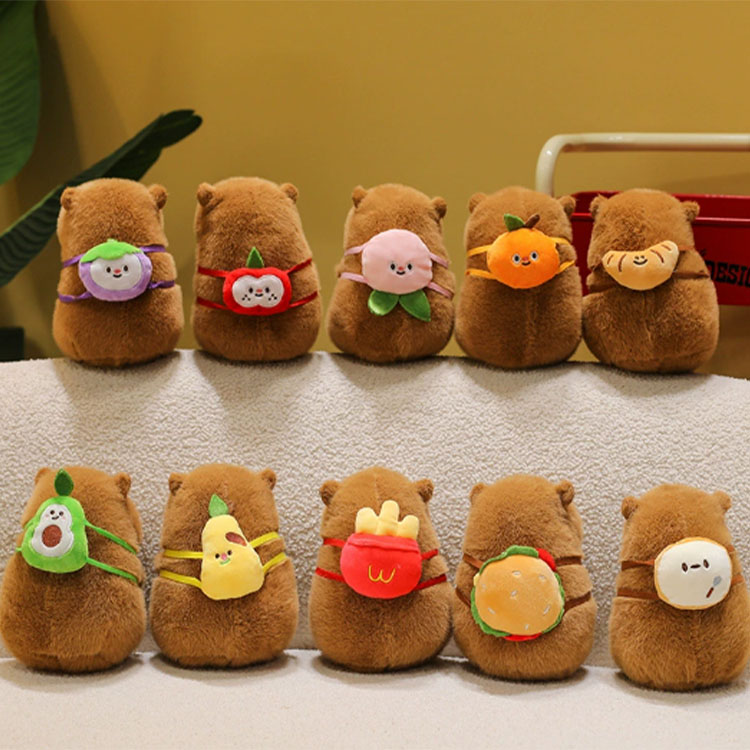 Esta boneca fofa de Capybara Plush tem uma aparência de Capybara. Todos os personagens desta série são em forma de mochila, e cada Capybara está carregando uma mochila diferente. Algumas capybaras estão carregando hambúrgueres nas costas, outras carregando berinjelas, outras carregando maçãs, outras carregando batatas fritas e também há peras e laranjas. Existem todos os tipos de capybaras, e cada um é muito fofo. Suas mochilas podem ser retiradas e há um total de 10 estilos diferentes. E cada mochila pequena é muito requintada.