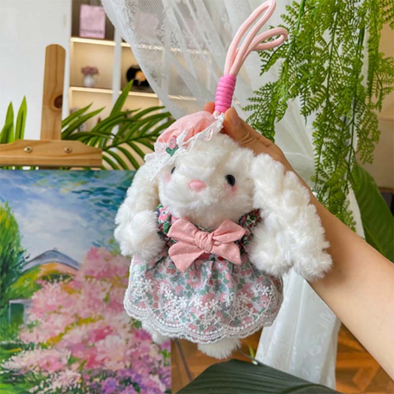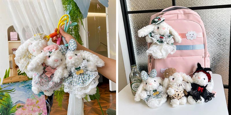 Entre esses coelhos pequenos, alguns estão usando vestidos pequenos, outros usam aventais pequenos e outros estão usando lenços pequenos. Suas roupas podem ser trocadas para frente e para trás. Você pode fazer seu próprio bricolage para este pingente e criar seu próprio estilo de correspondência. Suas roupas são muito requintadas, com decorações de rendas, e são extremamente bonitas. Além disso, os coelhos também têm acessórios: flores de borboleta e um pequeno chapéu. Alguns até têm uma bolsa presa.